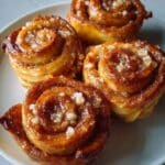 Four cinnamon rolls shaped like roses sit closely together on a white plate. Each roll has soft, golden brown layers of dough spiraled upwards with a rich cinnamon sugar coating that glistens, topped with scattered coarse sugar crystals that catch the light. The rolls have a slightly caramelized texture on the edges, showing a mix of light beige and darker brown hues, with some shiny sticky glaze on top. The plate rests on a white marbled surface, and the image feels warm and inviting. photo taken with an iphone --ar 4:5 --v 7