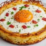 A round food nest with crispy golden-brown edges forms the base layer, made of thin, lightly browned strands that look like shredded potatoes. On top is a smooth, cooked white egg layer that fills the nest, slightly firm with a bit of texture from the potato edges. In the center, a bright, shiny, orange-yellow yolk sits perfectly round and runny. Small flecks of black pepper and green herbs are sprinkled over the yolk and the white egg layer. Tiny, crispy reddish-brown bacon pieces are scattered around, adding contrast to the creamy white and yellow colors. This dish rests on a simple white plate, placed on a white marbled textured surface. Photo taken with an iphone --ar 4:5 --v 7