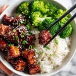 A white bowl holds a bed of fluffy white rice as the base layer, topped with bright green steamed broccoli on the left side, its texture soft but still fresh. On the right side, there are glossy, dark reddish-brown glazed tofu cubes that look crispy on the edges, sprinkled with white sesame seeds and small bits of green onion. Two black chopsticks held by a woman's hand pick up one tofu cube covered in shiny sauce and sesame seeds. The background is a white marbled texture. photo taken with an iphone --ar 4:5 --v 7
