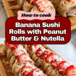Keywords: banana sushi, fruit snack, peanut butter banana roll, cream cheese strawberry sushi, nutella coconut sushi, healthy snack, no-cook snack, kid-friendly snack