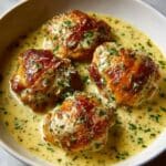 This Bobby Flay Chicken Thighs with Creamy Garlic Sauce recipe features juicy, bone-in, skin-on chicken thighs seared to golden perfection and simmered in a luscious, rich garlic cream sauce. The sauce combines butter, garlic, heavy cream, chicken broth, Dijon mustard, and lemon juice for a flavorful and comforting dish that’s perfect for dinner. Garnished with fresh parsley, this recipe brings a restaurant-quality meal to your table with simple stovetop cooking.