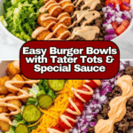 Keywords: burger bowl, tater tots, ground beef recipe, easy dinner, homemade burger sauce, quick meals