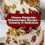 This Cherry Pistachio Cheesecake is a luscious dessert combining creamy cheesecake with the bright flavors of cherry and pistachio. The graham cracker and pistachio crust adds a delightful crunch, making it a perfect treat for any occasion.