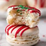 These Christmas Tree Cake Macarons are a festive twist on classic French macarons, inspired by the beloved holiday treat. Delicate almond shells sandwich a creamy, cake-filled center, decorated with white chocolate and colorful sprinkles for a fun, seasonal look.