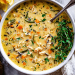 This creamy turkey wild rice soup is a comforting and hearty dish perfect for using leftover turkey. Loaded with aromatic vegetables, tender turkey meat, wild rice, and fresh herbs, it offers a rich and flavorful meal that warms you from the inside out. The addition of lemon juice and fresh herbs brightens the soup, while cream adds a luxurious texture. This large-batch recipe is ideal for family dinners and freezes beautifully for future meals.