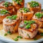 - Garnish and serve: Sprinkle chopped parsley or cilantro, sliced green onions, and sesame seeds over the coated salmon bites. Serve immediately as a delicious appetizer or snack.