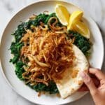 This Dandelion Greens with Crispy Fried Onions recipe features tender boiled dandelion greens dressed in lemon juice and olive oil, topped with deeply browned, crispy fried onions. Served alongside warm Arabic style pita bread, this dish offers a delightful combination of fresh, slightly bitter greens and rich, crunchy onions for a satisfying and authentic Mediterranean-inspired side or light meal.