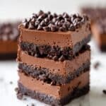 Decadent and rich cheesecake bars featuring a crunchy Oreo cookie crust layered with a smooth cream cheese and dark chocolate ganache, topped with mini semi-sweet chocolate chips. These no-bake bars offer a perfect balance of creamy texture and chocolatey indulgence with an optional hint of Baileys Irish Cream or Kahlua for added depth of flavor.