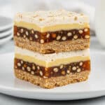 Two square layered bars are stacked on a white plate on a white marbled surface. Each bar has four distinct layers: the bottom layer is a light brown crumbly crust, above it is a thin pale yellow layer, then a thick textured dark amber layer with visible small seeds, and finally a top layer of creamy off-white with a slightly grainy texture. The bars are cut cleanly with sharp edges, showing each layer's details clearly. In the background, white plates and a white jug are softly blurred. photo taken with an iphone --ar 4:5 --v 7