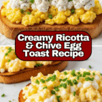 This Easy 6-Ingredient Egg and Ricotta Toast is a creamy, flavorful breakfast dish featuring soft scrambled eggs blended with fresh ricotta cheese and chives, served on golden toasted sourdough bread. Quick to prepare and delightfully rich, it’s perfect for a cozy morning treat.