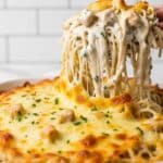 This Easy Chicken Tetrazzini is a comforting, cheesy pasta casserole featuring tender rotisserie chicken, a creamy chicken and cream cheese sauce, and a blend of mozzarella, cheddar, and parmesan cheeses. Perfectly baked to a golden bubbly finish, it makes a hearty family dinner that pairs wonderfully with fresh greens or bread.