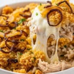 - Mix Ingredients: In a large bowl, combine the cooked rice, shredded chicken, cream of chicken soup, French onion soup, sour cream, shredded cheese, 1 cup of French fried onions, garlic powder, onion powder, salt, and black pepper. Mix thoroughly until all ingredients are well incorporated.