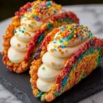 These Fruity Pebbles Cheesecake Tacos combine the nostalgic crunch of fruity cereal with a creamy, sweet cheesecake filling, folded into fun taco shapes for a delightful, no-bake dessert perfect for parties or a fun treat.