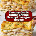 This Garlic Butter Shrimp Scampi Lasagna is a decadent fusion dish combining the flavors of classic shrimp scampi with the comforting layers of cheesy lasagna. Tender shrimp cooked in garlic butter and creamy parmesan sauce are layered with ricotta, mozzarella, and perfectly cooked noodles, then baked until golden and bubbling. It’s a delightful, savory meal perfect for seafood lovers looking for a unique twist on traditional lasagna.
