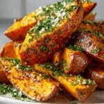 3. Season Sweet Potatoes: Toss the sweet potato slices in olive oil and evenly sprinkle salt, pepper, garlic powder, and paprika over them to enhance the flavor.