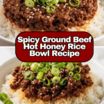 A flavorful Ground Beef Hot Honey Bowl combining savory browned beef with sweet and spicy honey glaze, served over rice and garnished with green onions and sesame seeds. This quick and easy skillet meal offers a perfect balance of sweet, smoky, and umami flavors for a satisfying weeknight dinner.