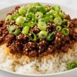 The dish shows a white bowl filled with shiny white rice as the bottom layer, with a glossy and slightly sticky texture. On top, there is a thick layer of dark brown minced meat mixed with a reddish oily sauce that seeps slightly into the rice. The top layer is garnished with bright green sliced scallions scattered all over, along with small white sesame seeds sprinkled evenly. The bowl sits on a white marbled surface. photo taken with an iphone --ar 4:5 --v 7
