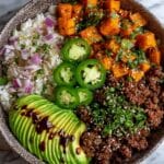 This Hackfleisch Hot Honey Bowl combines lean ground beef with flavorful spices, sweet roasted sweet potatoes, creamy cottage cheese, and fresh avocado slices, all drizzled with a spicy hot honey for a perfect balance of savory, sweet, and heat. It’s a nutritious and satisfying meal that comes together quickly using stovetop cooking methods, ideal for a wholesome lunch or dinner.