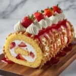 - Finish and Decorate: Remove the chilled cake roll from the fridge and unwrap it. Spread a thin layer of cheesecake filling on the outside of the roll. Generously sprinkle the strawberry shortcake crumble all over the coated cake. Garnish with fresh sliced strawberries, dollops of whipped cream, and drizzle with strawberry sauce. Slice and serve immediately.