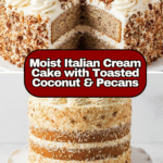 Italian Cream Cake is a moist, flavorful dessert filled with coconut and toasted pecans, layered with creamy, smooth frosting. Its delicate hints of vanilla and almond make this cake a timeless favorite for celebrations or any special occasion.