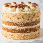 - Frost and layer: Spread frosting over the first layer and sprinkle with reserved toasted pecan pieces. Repeat with the second layer, then top with the third layer. Frost the top and sides of the entire cake evenly.