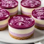 Five small round cheesecakes are on a white plate, each with three layers. The bottom layer is light brown and crumbly, the middle layer is thick and creamy white, and the top layer has a shiny deep purple swirl mixed with white, creating a marbled pattern on each cheesecake. The cheesecakes are close together in a circle with one in the middle, all placed on a white marbled surface with a soft white cloth nearby. photo taken with an iphone --ar 4:5 --v 7