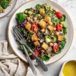 This vibrant Kale Quinoa Salad is a refreshing and nutritious dish packed with fresh vegetables, protein-rich quinoa and chickpeas, and a tangy homemade dressing. Perfect as a light lunch or a satisfying side, it’s easy to prepare and full of flavor.
