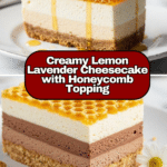 This Lemon Lavender Cheesecake with Honeycomb offers a delicate balance of citrus brightness and floral notes. Topped with fresh honeycomb and a drizzle of honey, it’s a stunning dessert perfect for special occasions or a sweet everyday treat.