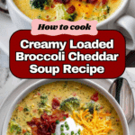 This Loaded Broccoli Cheddar Soup is a comforting classic packed with fresh broccoli and sharp cheddar cheese. Creamy, cheesy, and hearty, it makes for the perfect warm meal on chilly days. Adding bacon and green onions on top brings an irresistible savory crunch.