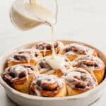 A white round ceramic baking dish holds nine golden-brown cinnamon rolls, each layer showing a swirl of rich dark brown cinnamon filling wrapped in soft dough. A woman's hand is pouring creamy white icing from a clear glass cup over the cinnamon rolls, which creates a glossy, melting layer on top. The rolls have a light crispy edge with a soft, fluffy inside, and the glaze drips slowly down the sides. The setting has a clean white marbled surface underneath the dish. photo taken with an iphone --ar 4:5 --v 7