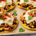 Keywords: Mexican tostadas, rotisserie chicken recipe, baked tostadas, easy Mexican dinner, chicken black bean corn tostadas