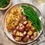This Parmesan Crusted Chicken Sheet Pan Dinner is a flavorful and easy-to-make meal perfect for busy weeknights. Tender chicken breasts are coated with a crispy parmesan and breadcrumb crust, then baked alongside seasoned red potatoes and fresh green beans for a complete, delicious one-pan dinner.