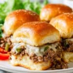 Keywords: Philly cheesesteak sliders, ground beef sliders, baked sliders, appetizer, party food, cream cheese sliders