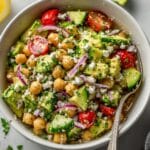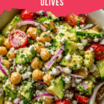 A refreshing and nutritious Quinoa Chickpea Salad packed with fresh vegetables, tangy feta cheese, and a zesty homemade dressing. This vibrant salad combines protein-rich quinoa and chickpeas with crisp cucumbers, sweet cherry tomatoes, briny kalamata olives, and fragrant parsley, making it perfect for a healthy lunch or light dinner.