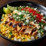 A vibrant and flavorful Street Corn Chicken Rice Bowl combining perfectly spiced and seared chicken with charred street-style corn, topped with creamy sauce, fresh avocado, and tangy lime for a satisfying and easy meal.