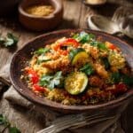 Store leftover couscous in an airtight container in the refrigerator for up to 3 days. Reheat gently in a microwave or on the stovetop with a splash of water or stock to restore moisture, stirring occasionally to heat evenly.