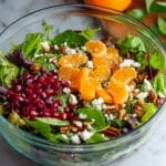 Keywords: Winter Salad, Mixed Greens, Mandarin Orange Salad, Pomegranate, Feta Cheese, Candied Pecans, Honey Dijon Dressing, Healthy Salad, Vegetarian Salad